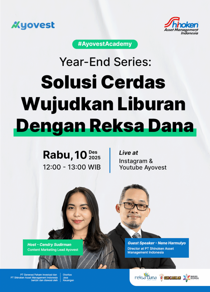 Untuk membantu kamu merencanakan liburan dengan lebih tenang, Ayovest bersama dengan Shinoken Asset Management menghadirkan live streaming berjudul “Solusi Cerdas Wujudkan Liburan dengan Reksa Dana”. Di sini, kamu akan belajar bagaimana Reksa Dana Pasar Uang dapat menjadi pilihan strategi yang tepat untuk mempersiapka liburan akhir tahun tanpa beban keuangan.