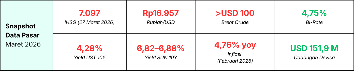 Yield SUN tenor 10 tahun mencatat kenaikan tajam sebesar +19 bps ke level 6,82% pada pekan 9-13 Maret, refleksi langsung dari tekanan outflow asing yang masif dan kenaikan yield global. Memasuki pekan terakhir Maret, yield bergerak di kisaran 6,82–6,88%, cenderung sideways dengan volatilitas yang mulai mereda.