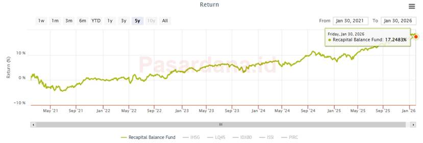 Per akhir Januari 2026, dana kelolaan Recapital Balance Fund tercatat sebesar Rp71,56 miliar dengan NAB per unit Rp827,18, dan dikelola oleh PT Recapital Asset Management yang telah berizin dan diawasi OJK.