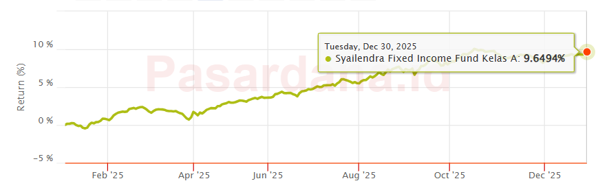 Dalam satu tahun terakhir, Syailendra Fixed Income Fund Kelas A mencatatkan kinerja positif dengan imbal hasil sebesar 9,51%* per 29 Desember 2025. Kinerja ini menunjukkan kemampuan reksa dana dalam mengoptimalkan peluang dari pergerakan pasar obligasi.