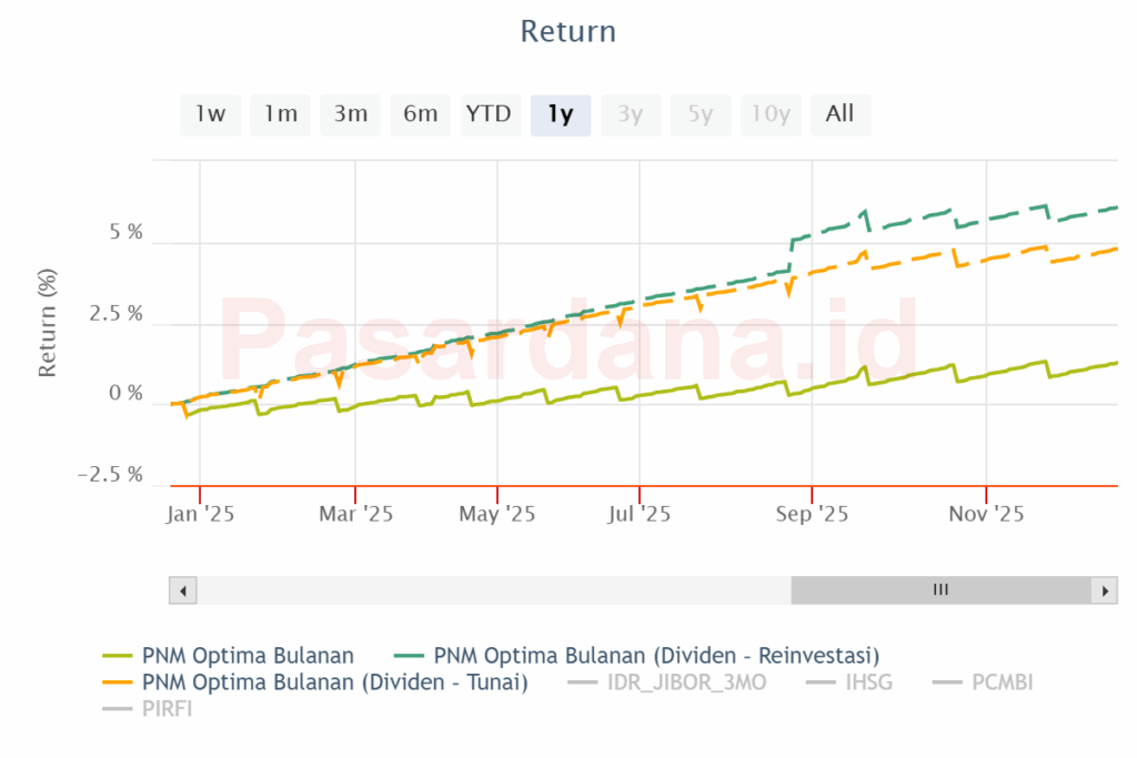 Reksa Dana PNM Optima Bulanan memiliki skema pembagian hasil investasi dalam bentuk reinvestasi dengan indikasi imbal hasil sebesar 6,07%* dan pembagian secara tunai sebesar 4,78%. Sementara itu, indikasi imbal hasil tanpa dividen tercatat sebesar 1,28%*