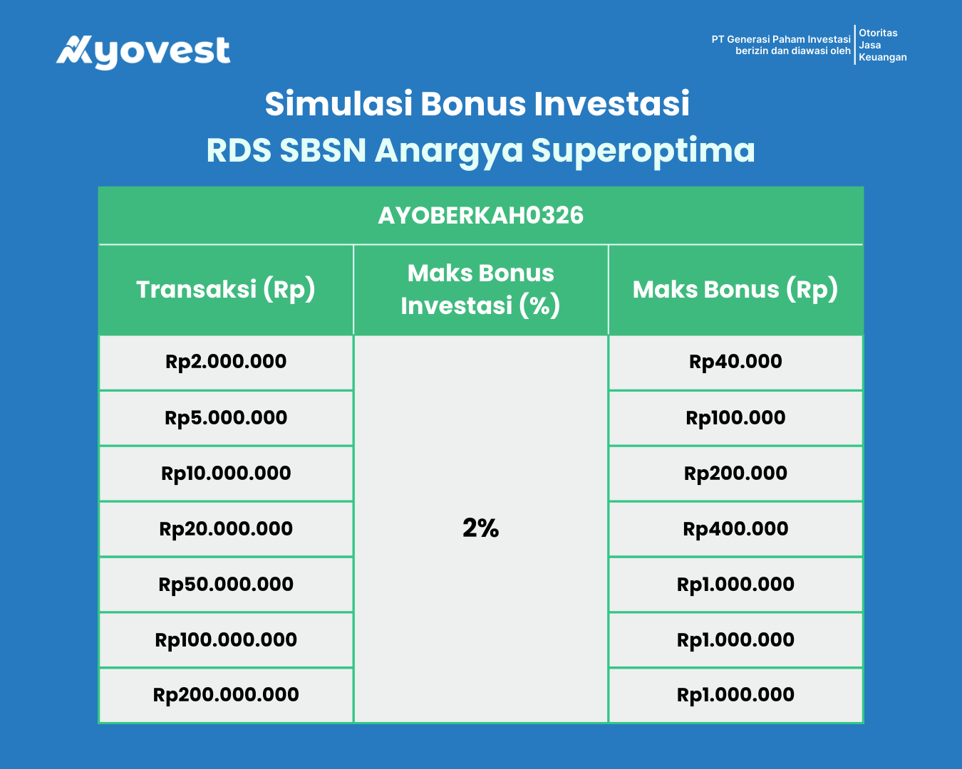 2. Promo Pembelian berlaku untuk pembelian produk Reksa Dana Syariah SBSN Anargya Superoptima yang dipasarkan di aplikasi Ayovest dengan memasukkan kode promo pembelian reksa dana: “AYOBERKAH0326” dan hanya dapat digunakan sebanyak satu kali dengan nominal pembelian minimal investasi Rp 2.000.000 per transaksi