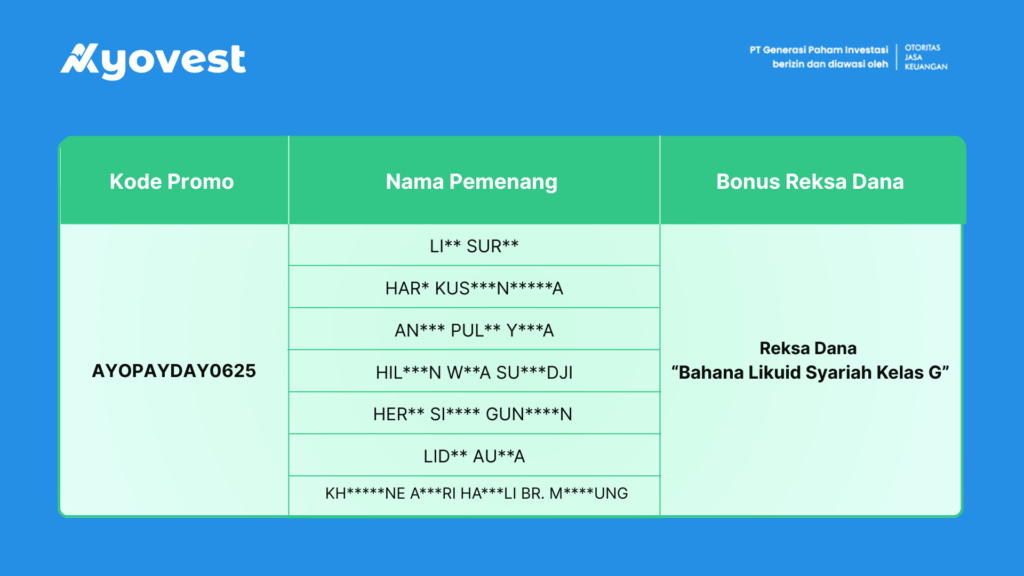 Kini saatnya pengumuman pemenang promo AYOPAYDAY0625 di Ayovest. Berikut nama-nama pemenang yang berhasil mengubah momen gajian menjadi langkah investasi yang lebih bernilai.